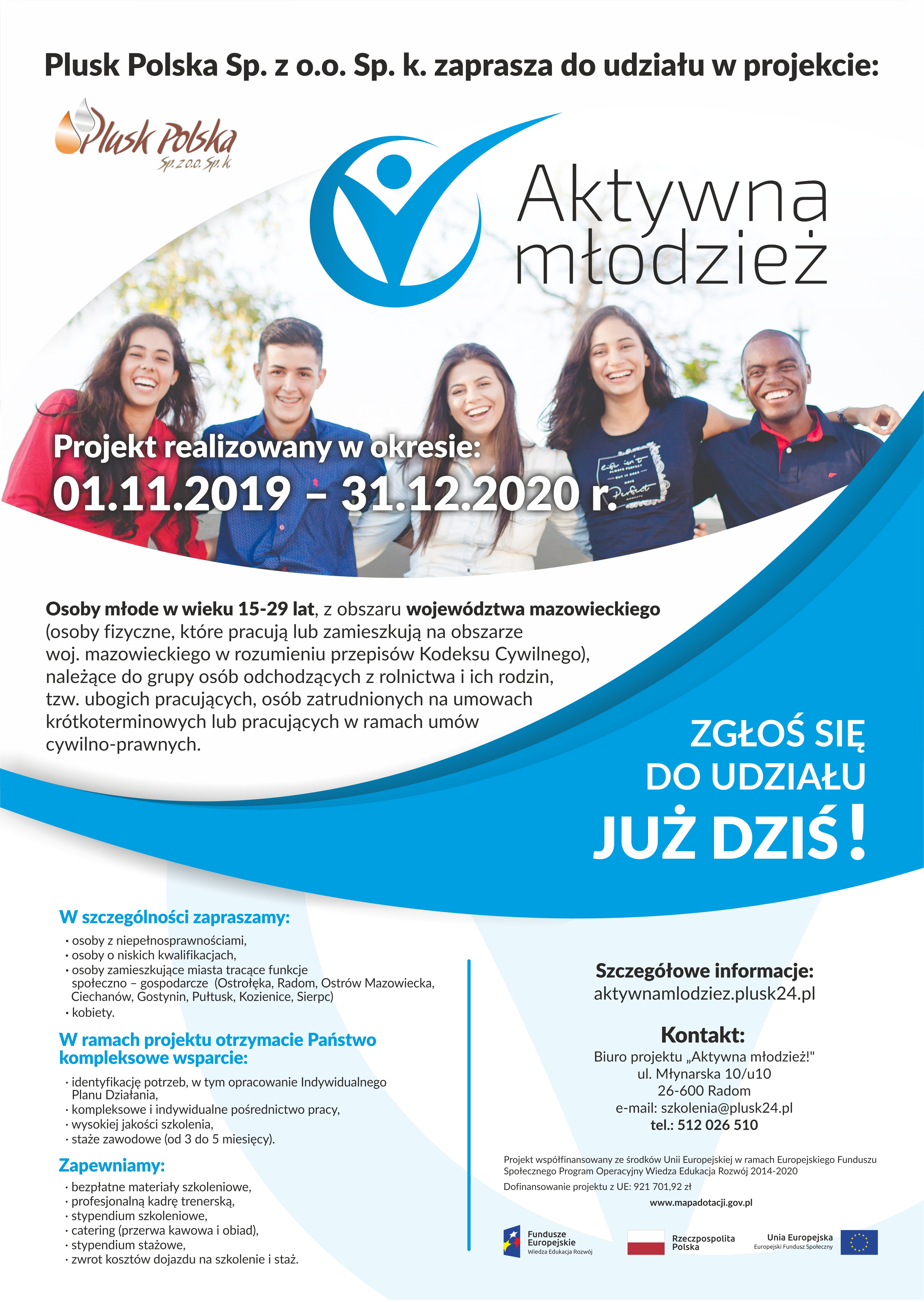 Z przyjemnością informujemy, że dnia 01.11.2019 r. rozpoczęliśmy realizację projektu „Aktywna młodzież!” współfinansowanego z Europejskiego Funduszu Społecznego w ramach Osi Priorytetowej I Osoby młode na rynku pracy, Działania 1.2 Wsparcie osób młodych na regionalnym rynku pracy - projekty konkursowe, Program Operacyjny Wiedza Edukacja Rozwój 2014-2020.